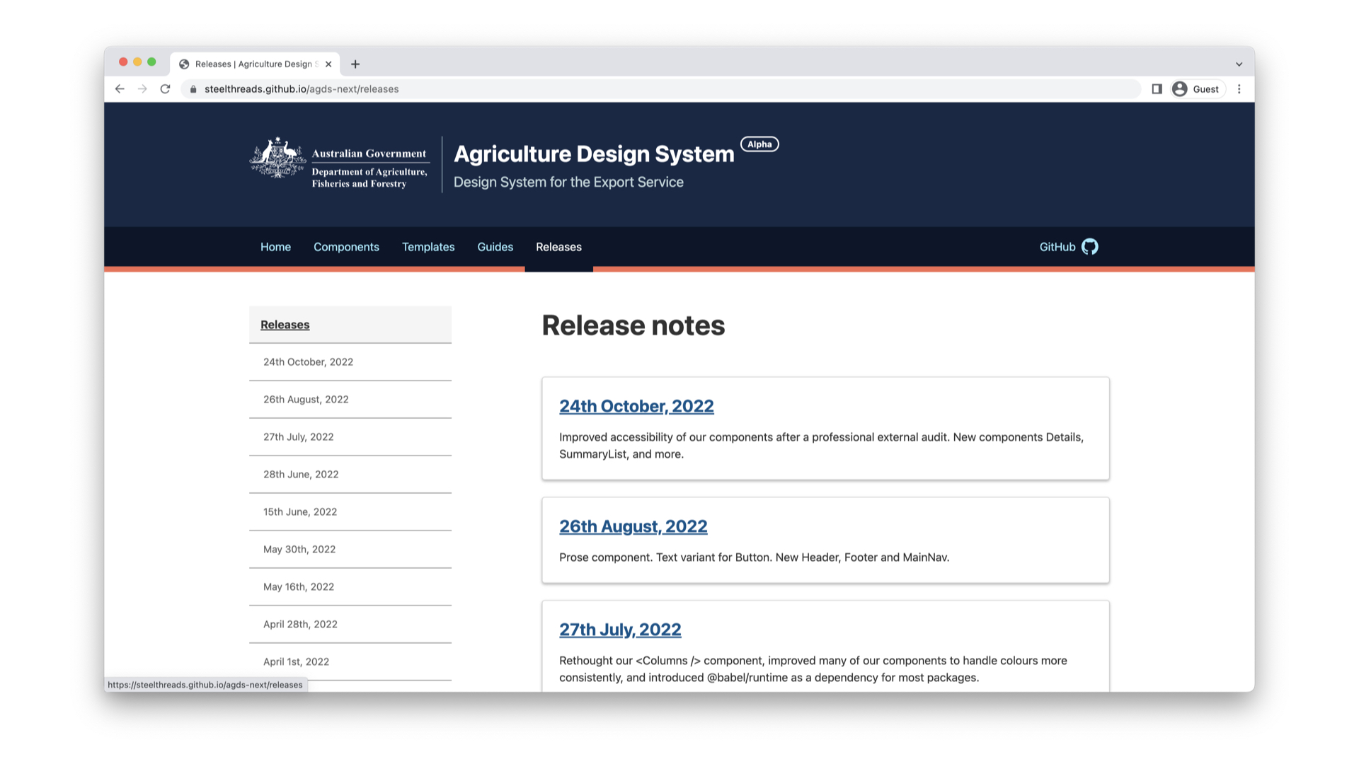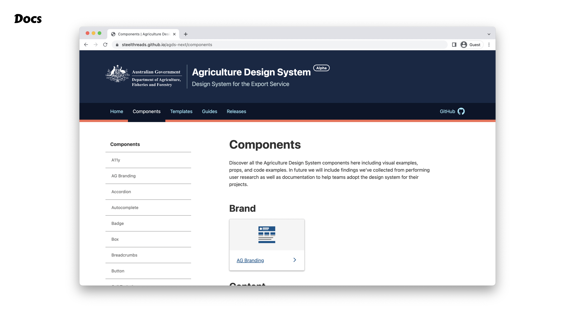 AgDS Builds on the excellent work and legendary status of the Gold DS, which came out of the DTA and has proven to be a north star for the team. Past contributors/maintainers speckled around here tonight (if you’ve worked on Gold, maybe raise your hand). I believe Gold was announced here at the first Design System meetup.
