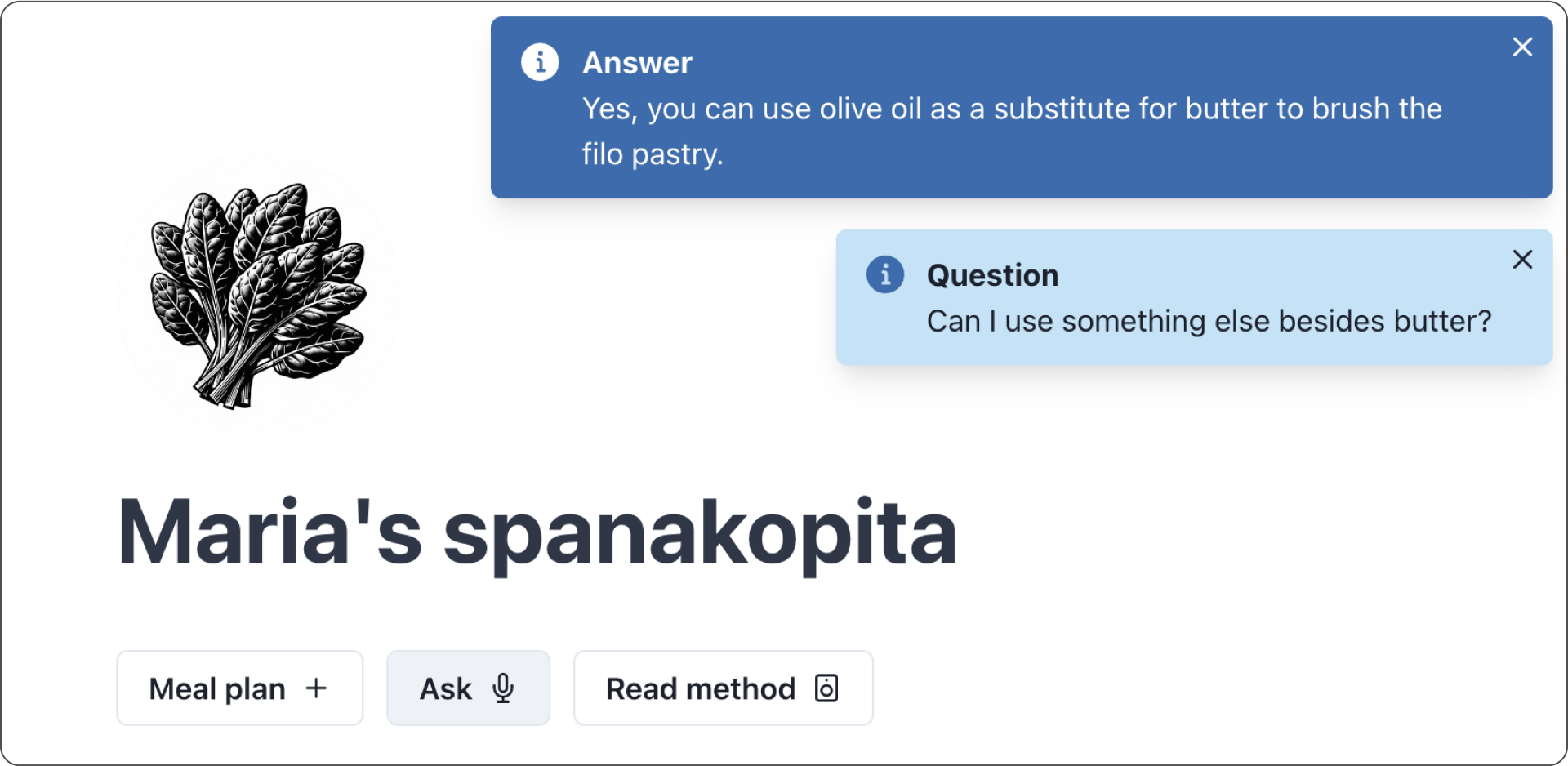 So during cooking weāre anticipating that the chef may ask one or two questions during the process. The first question regards the step of wilting the spinach. What does wilted spinach look like? Well, letās ask GPT4o.