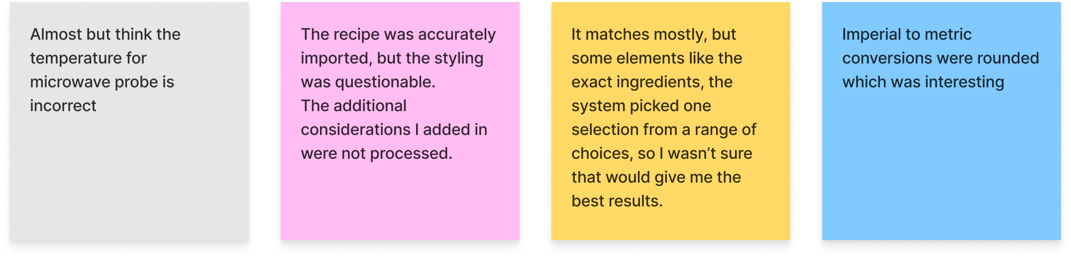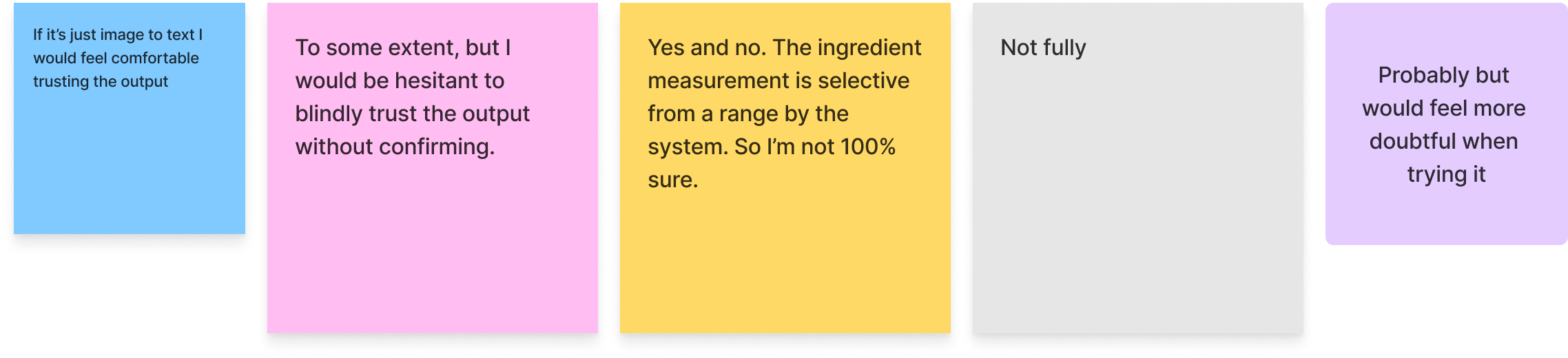 When asked if they could trust the output, most participants remarked they still hesitate when preparing the recipe. Participants wouldn't want to waste food or spoil their cooking. It was also noted that in the UI there's no way to compare the instructions to the source material.